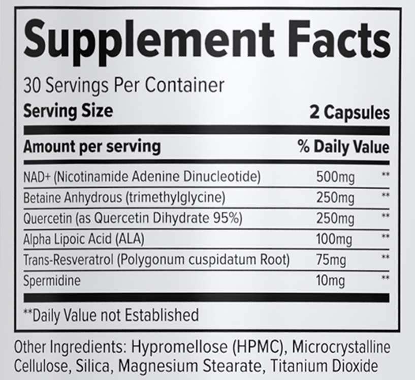 Support healthy aging from the inside out with our powerful NAD+ formula, designed to replenish declining cellular energy and activate longevity pathways. Enhanced with Betaine Anhydrous to support methylation and preserve NAD+ levels, and Quercetin to reduce inflammation and promote cellular cleanup through senolytic action. Alpha-Lipoic Acid (ALA) provides antioxidant protection and boosts mitochondrial health, while Spermidine encourages autophagy—a key process in cellular renewal. Together, these ingredients work synergistically to combat signs of aging and restore optimal vitality at the cellular level.*